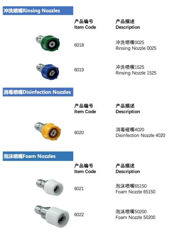 – Béc phun màu trắng: Phun bọt vệ sinh, béc phun hình quạt, góc phun “50” độ, lưu lượng 200 L/P, áp suất 20bar. Mã hàng 6022