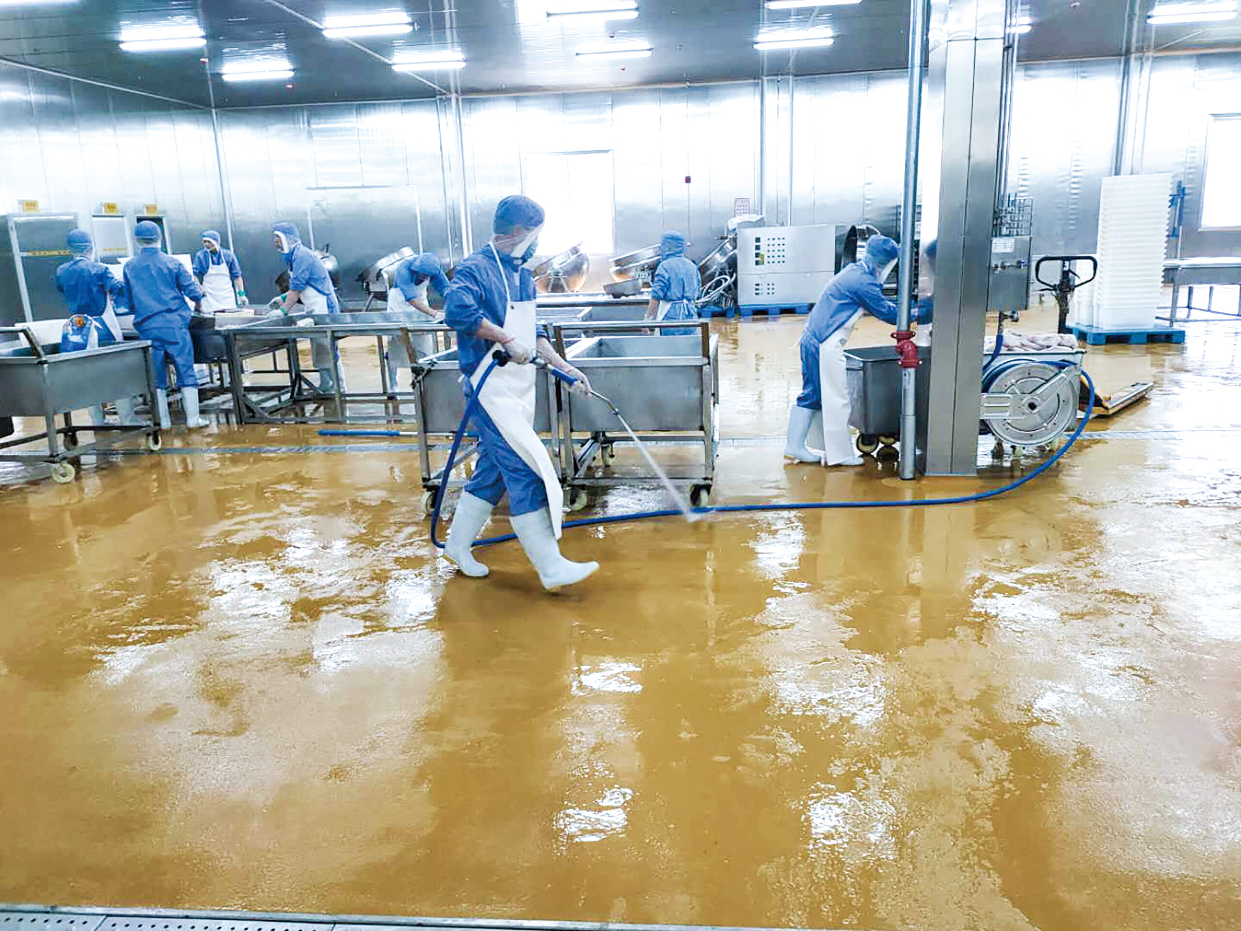 – Tráng nước, phun bọt vệ sinh, phun chất khử trùng